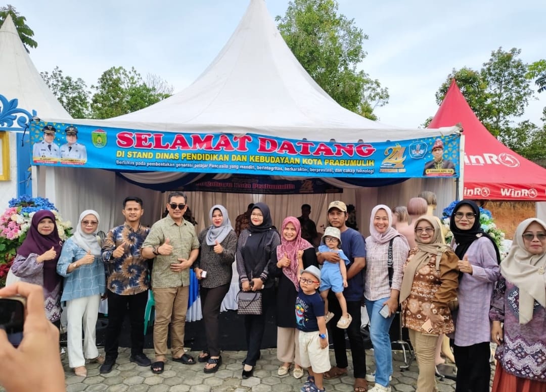 Sekretaris Dinas Pendidikan kata mata hitam pose bersama du stand Dinas Pendidikan Talang Jimar--