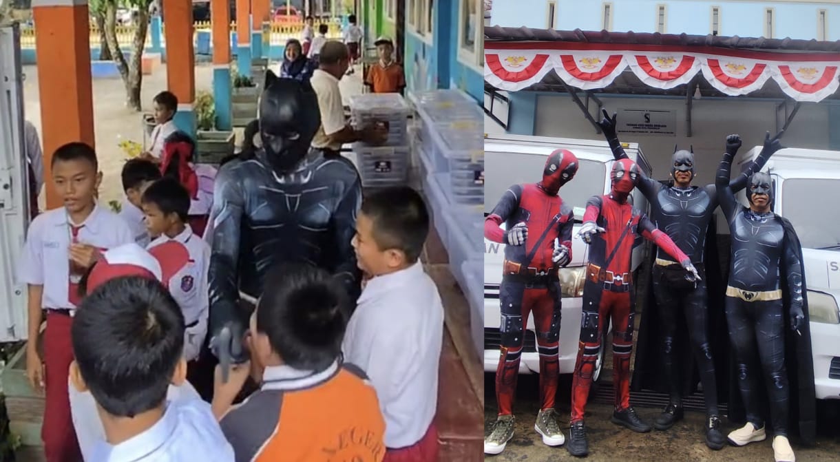 Saat pendistribusian petugas pengantar MBG memakai kostum superhero, seperti Batman, Spiderman, Deadpool.
